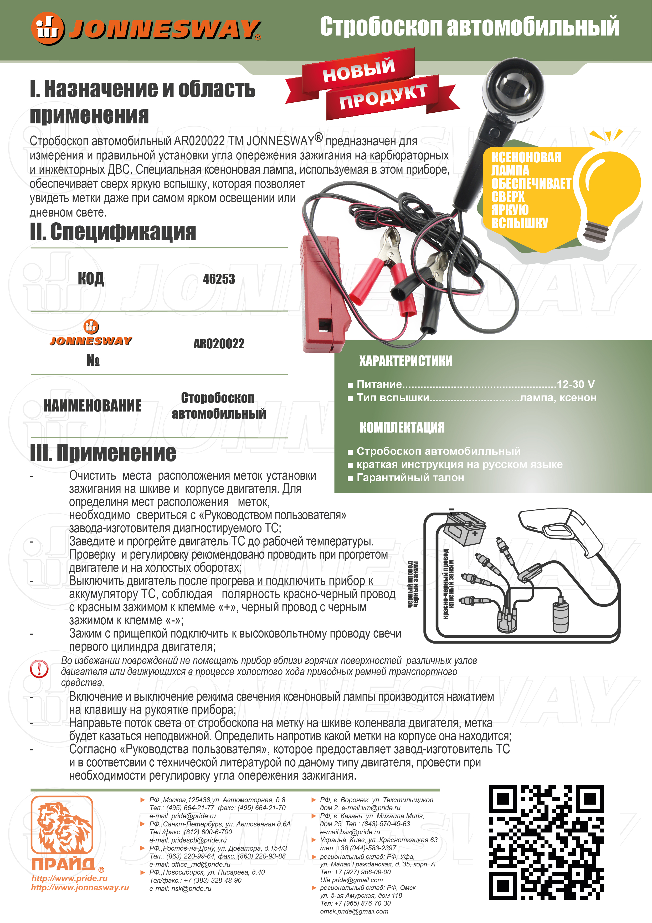 Стробоскоп автомобильный AR020022 предназначен для измерения и правильной установки угла опережения зажигания на карбюраторных и инжекторных ДВС. Специальная ксеноновая лампа, используемая в этом приборе, обеспечивает сверх яркую вспышку, которая позволяет увидеть метки даже при самом ярком освещении или дневном свете.