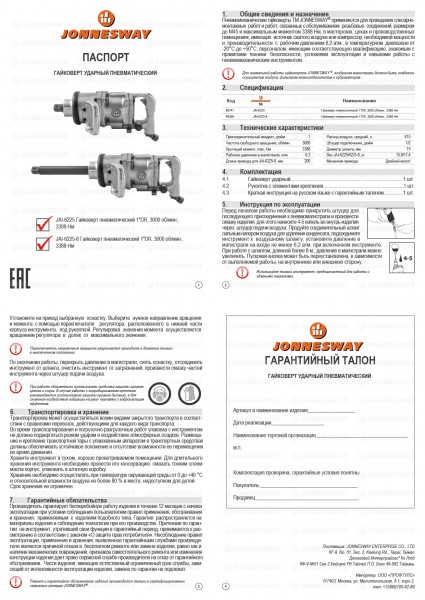 Пневматический, тяжелый гайковерт JAI-6225 применяется при производстве работ по обслуживанию экстремально нагруженных резьбовых соединений, размером до М45 и максимальным моментом 3388 Nm. Рекомендуется для использования при обслуживании тяжелой дорожной, строительной и сельскохозяйственной техники, создании крупногабаритных металлоконструкций и т.п. Пусковая кнопка может быть переустановлена, в зависимости от выполняемой работы, на внутреннюю или внешнюю сторону рукоятки. Во время производства работ с применением пневматических ударных гайковертов, рекомендуется использование перчаток с виброгасящими накладками и средств защиты органов зрения и слуха.