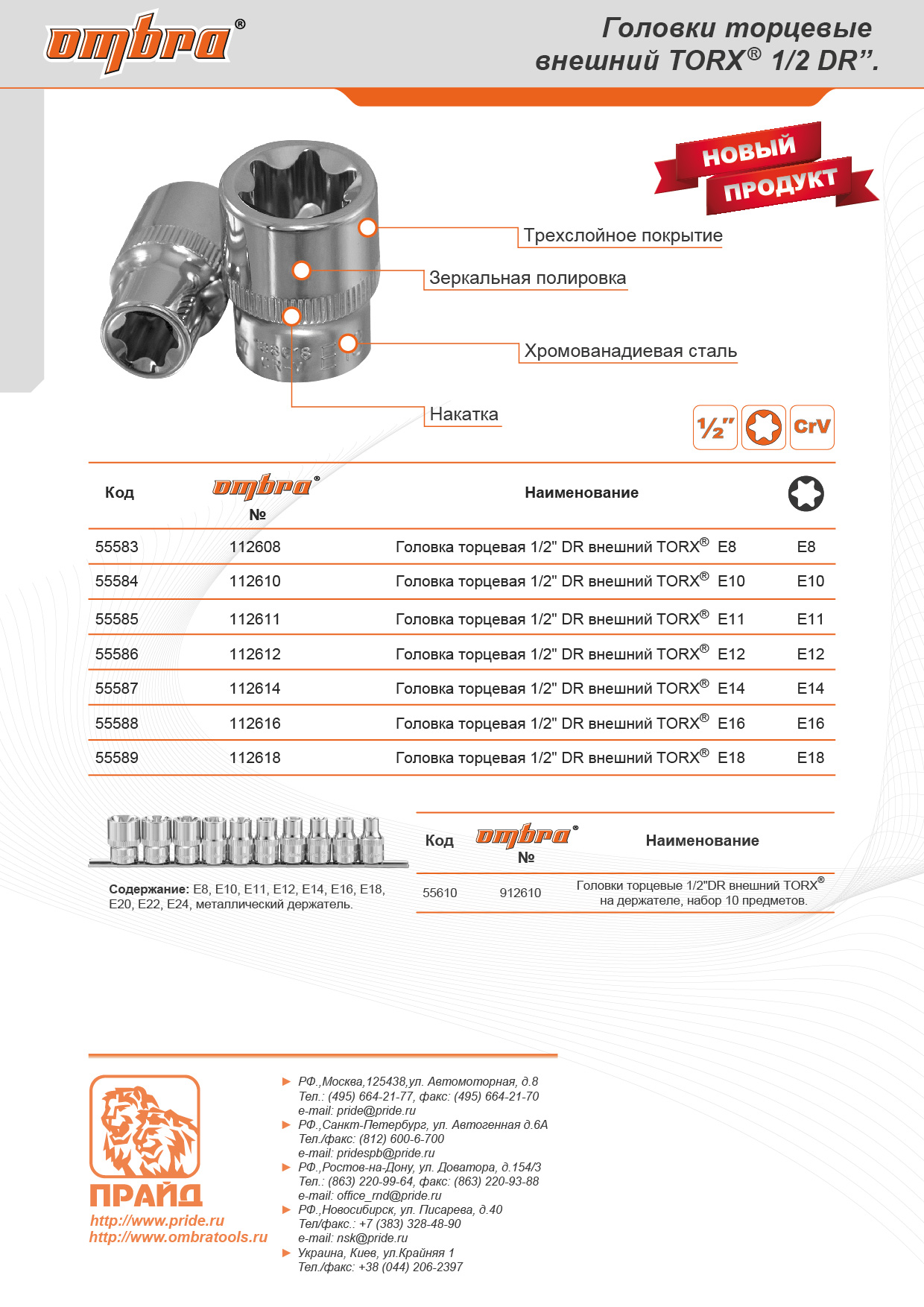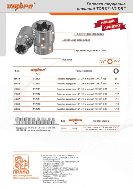 Теги: Головка торцевая 1/2"DR, внешний TORX®, E16