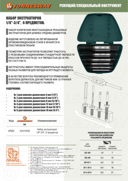 Набор конических многозаходных резьбовых экстракторов для шпилек средних диаметров. Инструменты изготовлены из легированной хромомолибденовой стали, хранятся в пластиковом пенале. Экстракторы имеют присоединительные квадраты разных размеров для передачи крутящего момента. При использовании, в качестве воротка, рекомендуется применение разводного метчикодержателя. В качестве альтернативы можно использовать разводной гаечный ключ или 12-гранную торцевую головку подходящего размера с приводом.