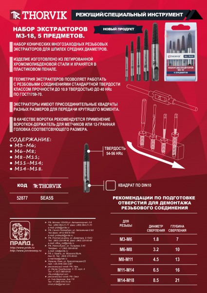 НАБОР КОНИЧЕСКИХ МНОГОЗАХОДНЫХ РЕЗЬБОВЫХ ЭКСТРАКТОРОВ ДЛЯ ШПИЛЕК СРЕДНИХ ДИАМЕТРОВ. ИЗДЕЛИЕ ИЗГОТОВЛЕНО ИЗ ЛЕГИРОВАННОЙ ХРОМОМОЛИБДЕНОВОЙ СТАЛИ И ХРАНЯТСЯ В ПЛАСТИКОВОМ ПЕНАЛЕ. ГЕОМЕТРИЯ ЭКСТРАКТЕРОВ ПОЗВОЛЯЕТ РАБОТАТЬ С РЕЗБОВЫМИ СОЕДИНЕНИЯМИ СТАНДАРТНОЙ ТВЕРДОСТИ И КЛАССОМ ПРОЧНОСТИ ДО 10.9 С ТВЕРДОСТЬЮ ДО 40 HRc ПО ГОСТ1759-70. ЭКСТРАКТОРЫ ИМЕЮТ ПРИСОЕДИНИТЕЛЬНЫЕ КВАДРАТЫ РАЗНЫХ РАЗМЕРОВ ДЛЯ ПЕРЕДАЧИ КРУТЯЩЕГО МОМЕНТА. В КАЧЕСТВЕ ВОРОТКА РЕКОМЕНДУЕТСЯ ПРИМЕНЕНИЕ ВОРОТКОК-ДЕРЖАТЕЛЬ ДЛЯ МЕТЧИКОВ ИЛИ 12-ГРАННАЯ ГОЛОВКА СООТВЕТСВУЮЩЕГО РАЗМЕРА