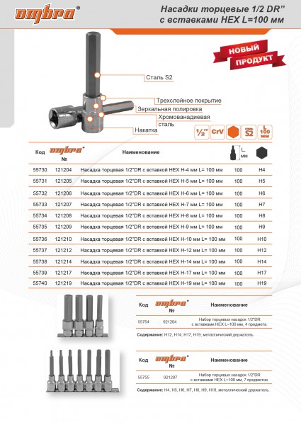 Теги: Насадка торцевая 1/2"DR с вставкой-битой шестигранной, Н17, 100 мм