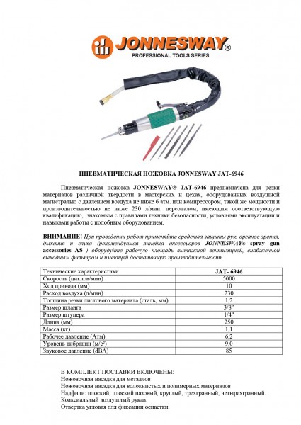 Пневматическая ножовка – универсальный инструмент возвратно-поступательного действия, предназначенный для резки листовых металлов и материалов различной твердости, зачистки и опиловки в зависимости от применяемой насадки. При проведении работ необходимо применять средства защиты рук, органов зрения, дыхания и слуха.