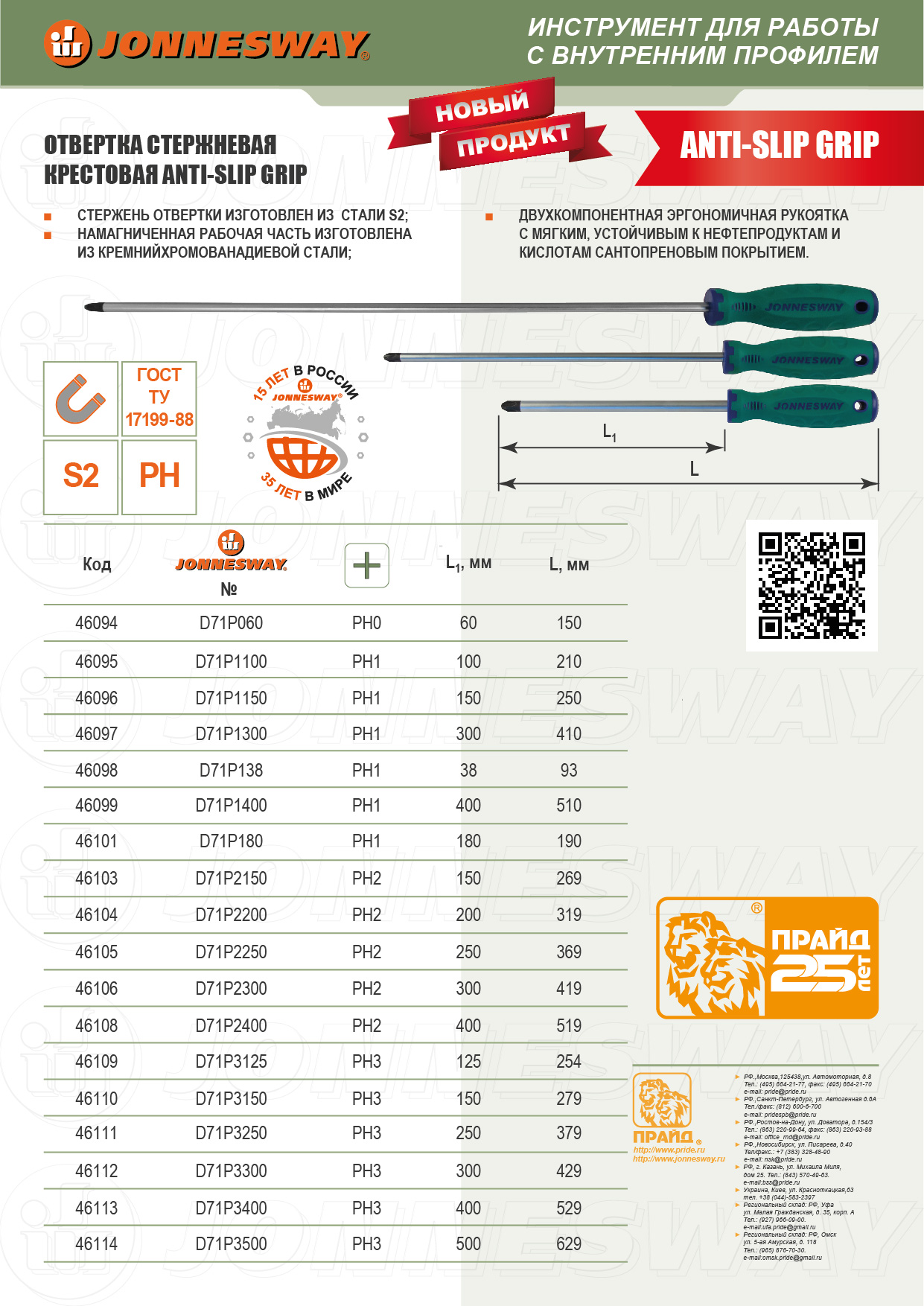 Отвертки серии "D71" "ANTI-SLIP GRIP" JONNESWAY® изготовлены в соответствии с требованиями стандарта DIN 5262, отвечают техническим условиям ГОСТ 17199-88. Намагниченные рабочие части, изготовленные из кремнийхромованадиевой стали, легко и надежно удерживают крепеж, что делает инструмент удобным при работе в труднодоступных местах. Двухкомпонентная, эргономичная рукоятка с мягким, устойчивым к нефтепродуктам и кислотам сантопреновым покрытием обеспечивает надежный хват, практически исключающий проскальзывание инструмента в руке оператора.