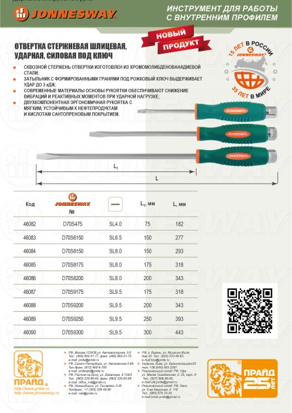 Стержневая отвертка серии "D70" со сквозной установкой стержня из хромомолибденованадиевой стали, намагниченным наконечником и затыльником рукоятки, выдерживающим воздействие удара, ограниченно превращающего отвертку в подобие кернера или выколотки. На затыльнике сформированы грани для применения рожкового ключа, увеличивающего крутящий момент при воздействии на резьбовой крепежный элемент. Современные материалы основы рукоятки обеспечивают снижение вибраций и реактивных моментов при ударной нагрузке, а сантопреновый, устойчивый к скольжению, верхний контактный слой - надежное удержание инструмента в руке.