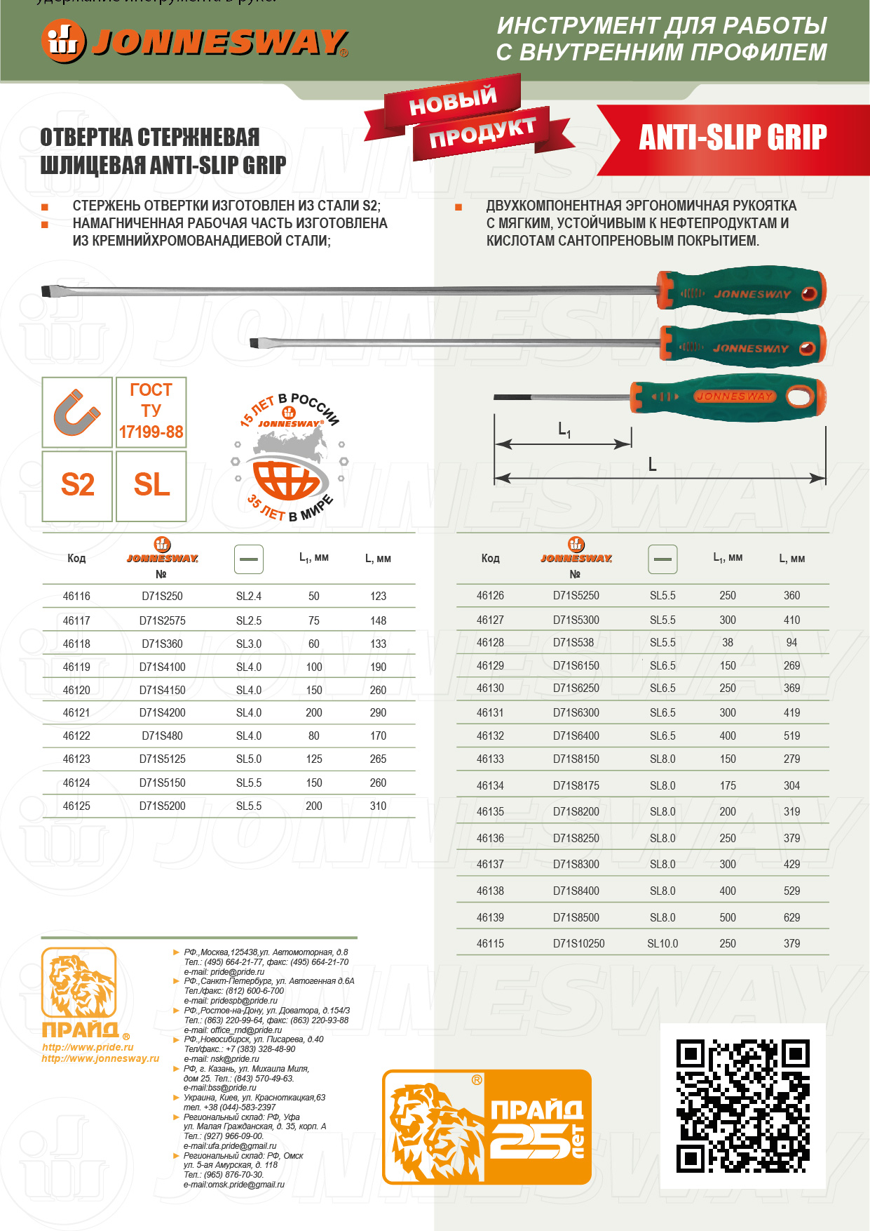 Отвертки серии "D71" "ANTI-SLIP GRIP" JONNESWAY® изготовлены в соответствии с требованиями стандарта DIN 5262, отвечают техническим условиям ГОСТ 17199-88. Намагниченные рабочие части, изготовленные из кремнийхромованадиевой стали, легко и надежно удерживают крепеж, что делает инструмент удобным при работе в труднодоступных местах. Двухкомпонентная, эргономичная рукоятка с мягким, устойчивым к нефтепродуктам и кислотам сантопреновым покрытием обеспечивает надежный хват, практически исключающий проскальзывание инструмента в руке оператора