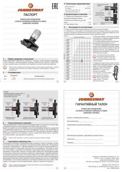 Прибор представляет собой простое устройство, с помощью которого возможно точно настроить натяжение ремней приводов агрегатов или зубчатого ремня ГРМ, согласно документации к автомобилю. Применение данного изделия позволяет определить качественное состояние ремня и степень его натяжения. Новый ремень имеет большее предварительное натяжение, при этом измеряется либо прогиб (стрелу) ремня под известной нагрузкой, либо нагрузку, которую нужно приложить для получения заданного прогиба. Один оборот рукоятки, 360° соответствует величине перемещения толкателя 1 мм, что соответствует 10N.